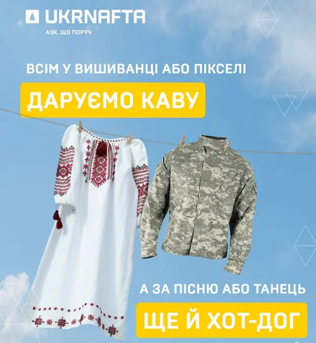 У межах спеціальної акції кожен, хто завітає на АЗК у вишиванці або військовій формі, отримає безкоштовну каву. А ті, хто не лише одягне вишиванку, але й заспіває українську пісню або станцює, отримають додатково хот-дог.