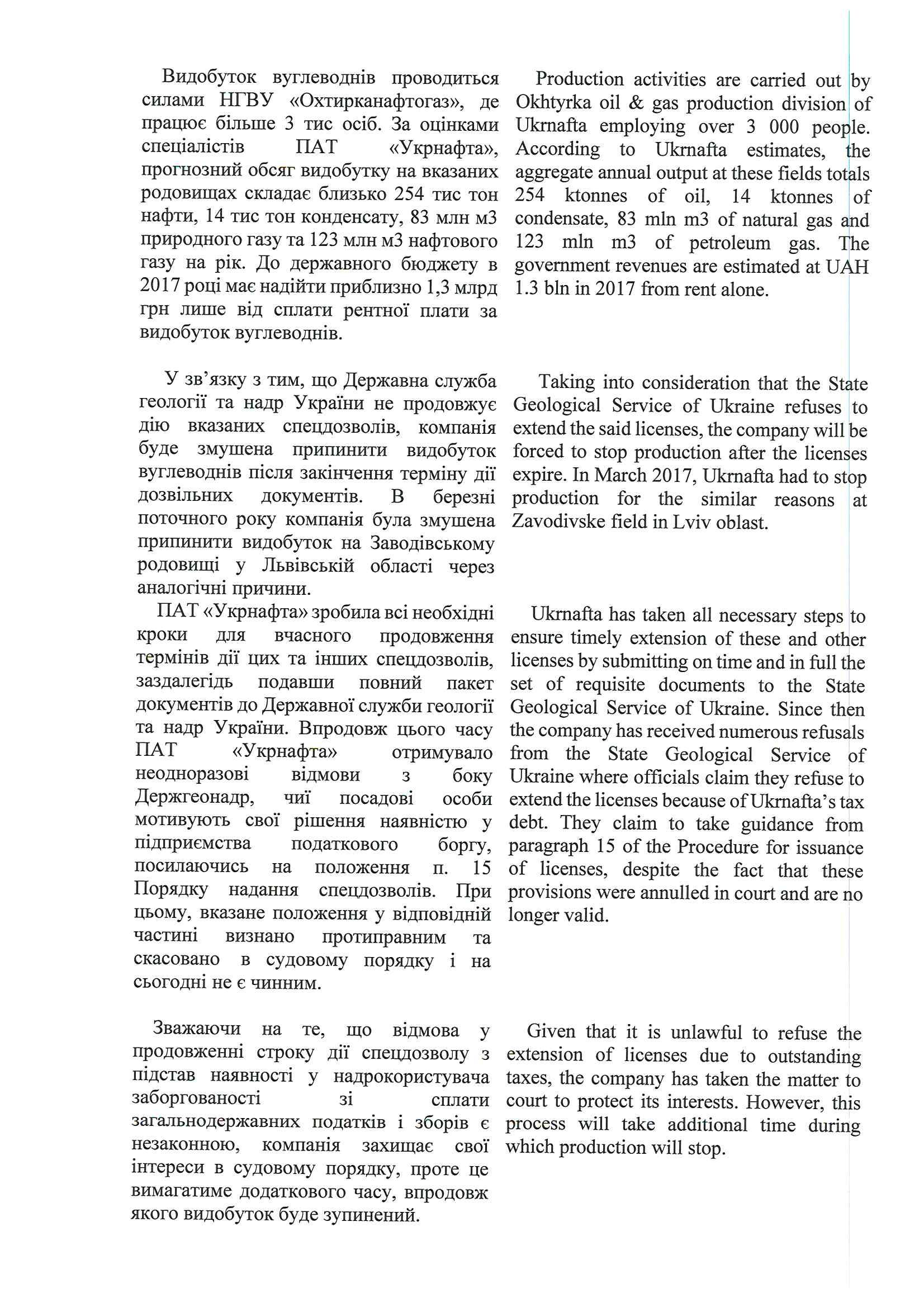 В «Укрнафте» отмечают, что остановка добычи может привести к потере 1500 рабочий мест, недополучения 1 млрд грн платежей в бюджеты, а также существенной потере в добыче углеводородов.