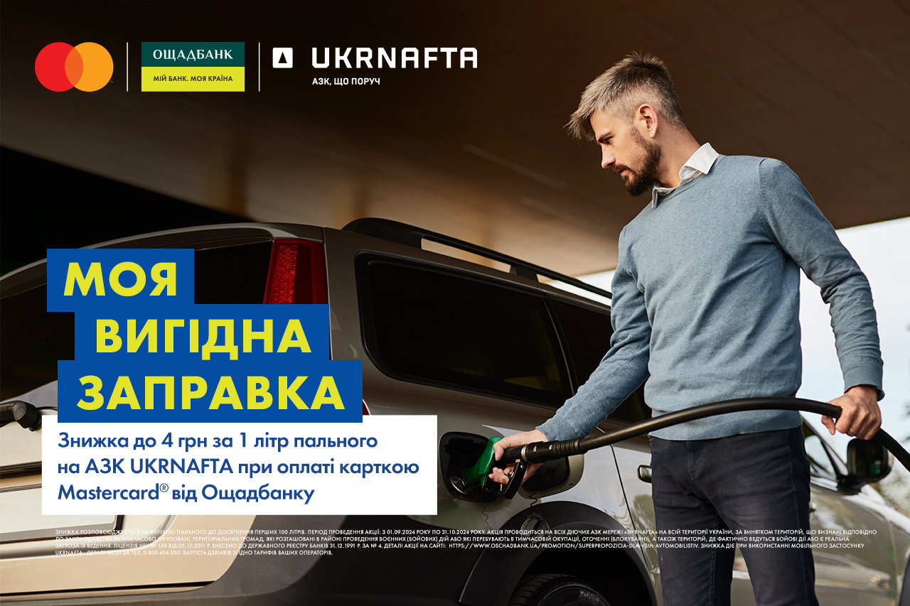 Акція триває з 1 вересня до 31 жовтня включно. Щоб отримати знижку, необхідно розрахуватися за пальне карткою Mastercard від «Ощадбанку» на автозаправних комплексах мережі Ukrnafta. Розмір знижки на бензин та дизель становить 4 грн/л від ціни на стелі АЗК, а на скраплений газ (LPG) — 1 грн/л.