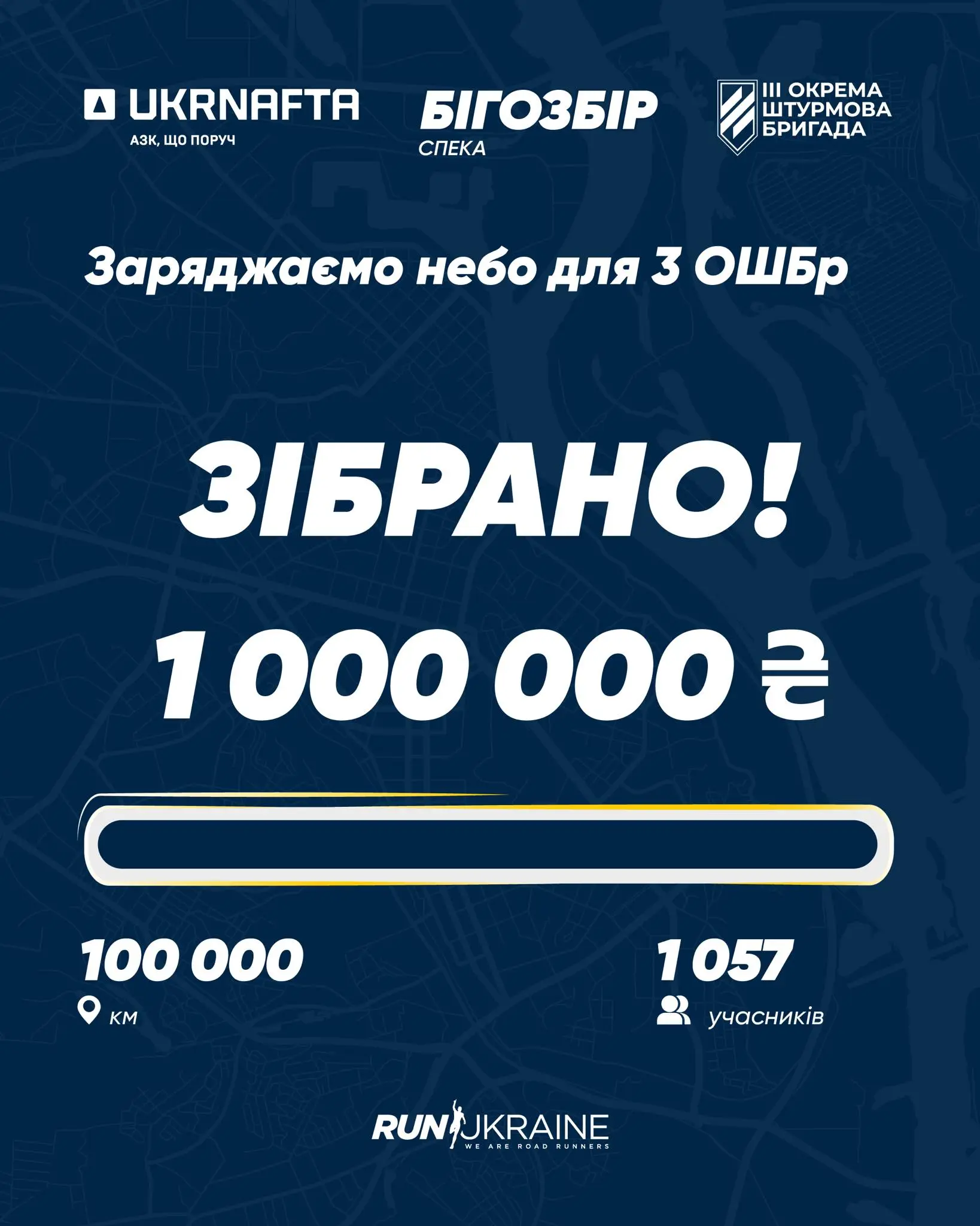 Бігозбір «Заряджаємо небо для 3 ОШБр» успішно завершено. За місяць 1 057 небайдужих бігунів та бігунок подолали 100 тис. км. За кожен кілометр Ukrnafta перераховувала 10 гривень. Тож у підсумку вдалося зібрати 1 000 тис. грн, розповіли в компанії.