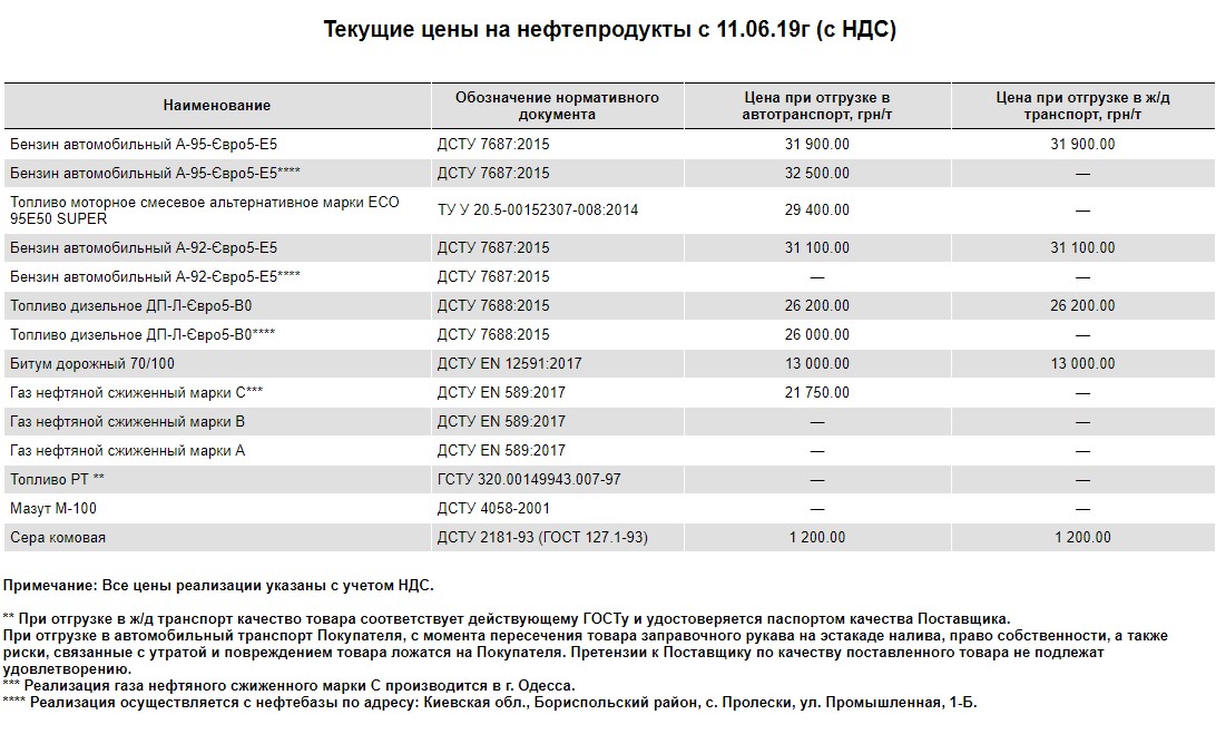Как сообщили в компании, с Борисполя (с. Пролески, ул. Промышленная, 1-Б) реализуется два вида кременчугской продукции – бензин марки А-95 и ДТ. В скором времени ожидаются отгрузки А-92 бензина. Из слов источника, объемы реализации «достаточные», в пределах нескольких тыс. т. На данный момент, реализация происходит на условиях самовывоза. По состоянию на 11 июня, стоимость А-95 бензина насчитывала 32 500 грн/т, а дизтоплива – около 26 000 грн/т.