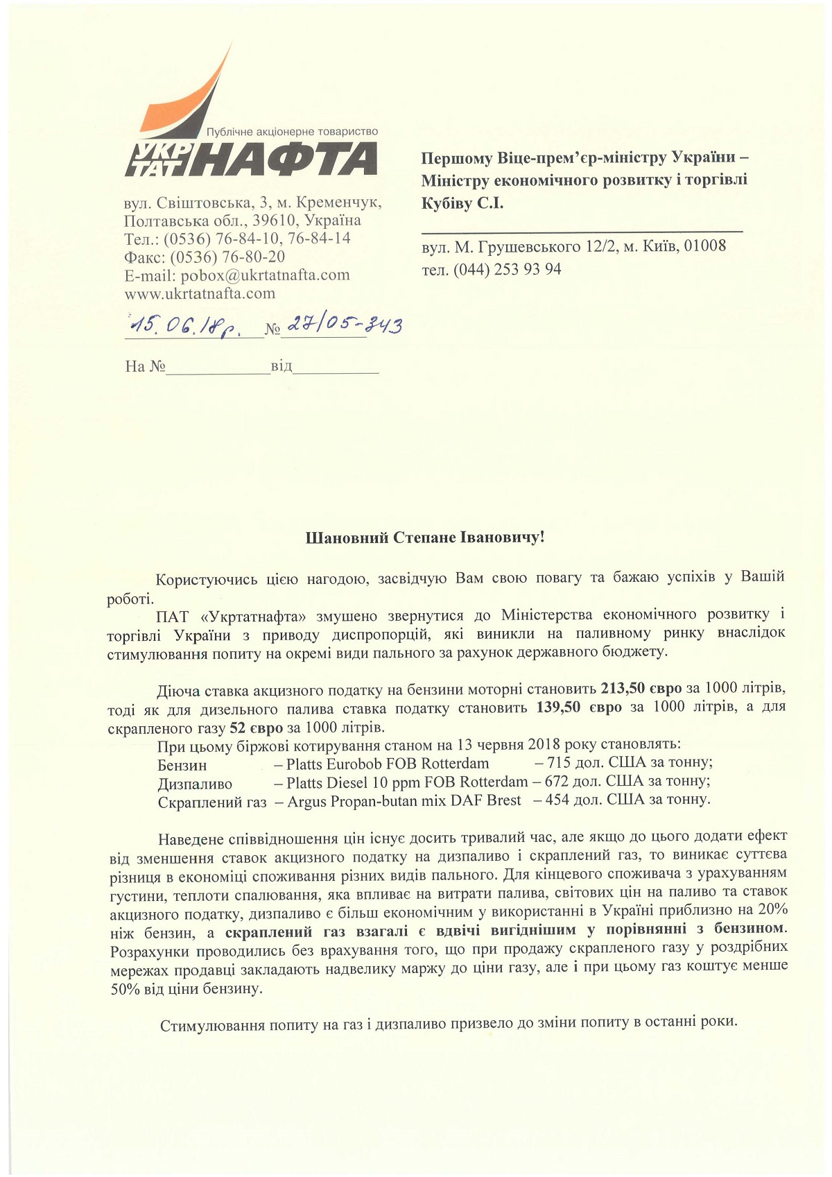 ПАО «Укртатнафта» (Кременчугский НПЗ) обратилось с письмом в Министерство экономического развития и торговли с предложением уменьшить акциз на бензин и повысить на дизтопливо и сжиженный газ.