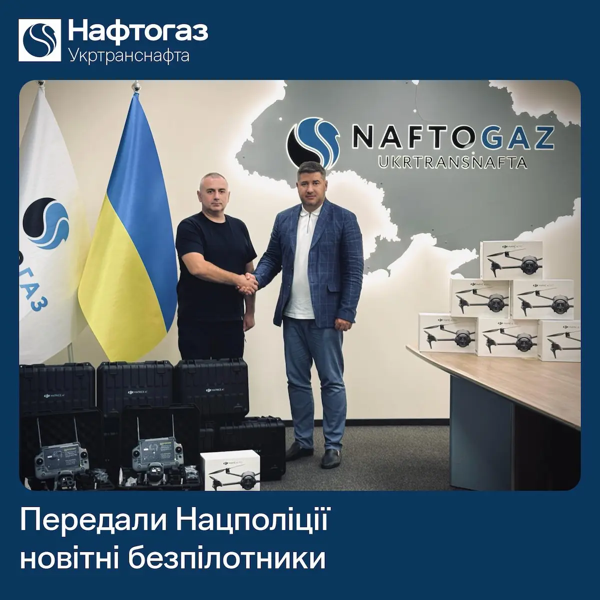 Держкомпанія «Укртранснафта», що входить до Групи Нафтогаз, передала Національній поліції партію безпілотників. Вони здатні працювати у будь-яку пору доби, вести спостереження з великої висоти, виявляти цілі за допомогою тепловізійних сенсорів і передавати детальну картинку в реальному часі.