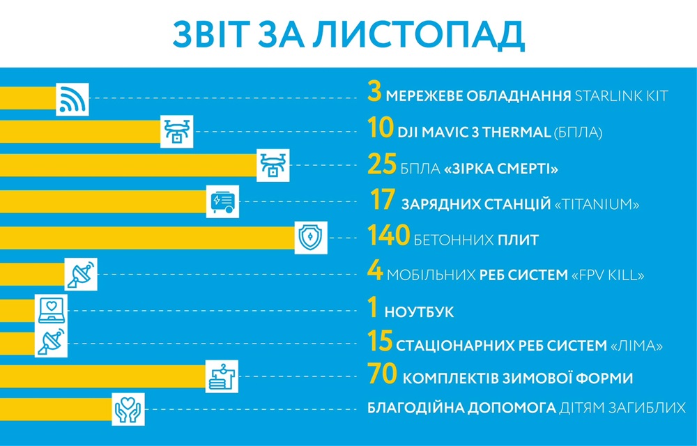 «У листопаді серед переданого нашим оборонцям: дрони-камікадзе, зарядні станції, бетонні плити військового призначення, а також мобільні і стаціонарні засоби радіоелектронної боротьби», — йдеться у повідомленні.