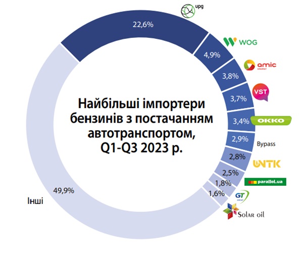 Так, протягом трьох кварталів 2023 частка UPG серед усіх імпортерів бензинів автотранспортом склала 22,6%.
