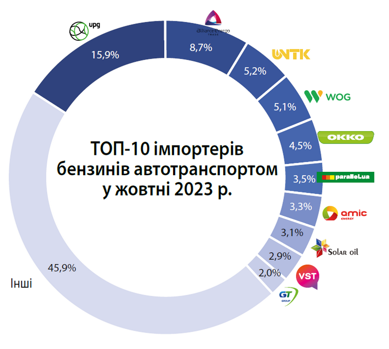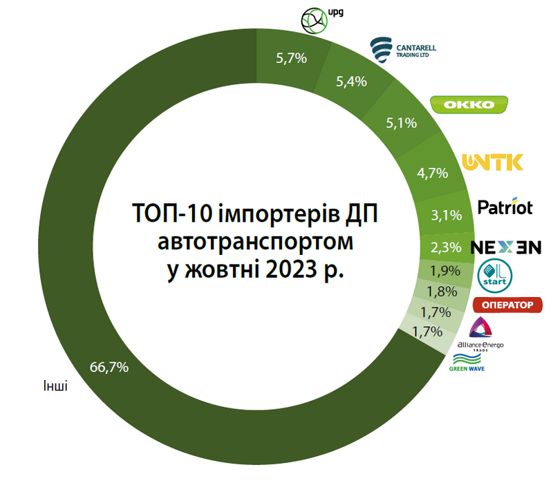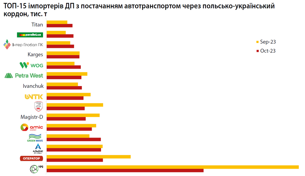 Компанія «Укрпалетсистем», оператор національної мережі АЗК UPG, в жовтні 2023 р. імпортувала найбільший обсяг дизпального автотранспортом серед всіх постачальників, йдеться в аналітичному випуску НафтоРинку Monthly fuels&LPG. За підрахунками аналітиків НафтоРинку, компанія завезла 5,8% дизпального та 15,9% бензину, які імпортувались автотранспортом.
