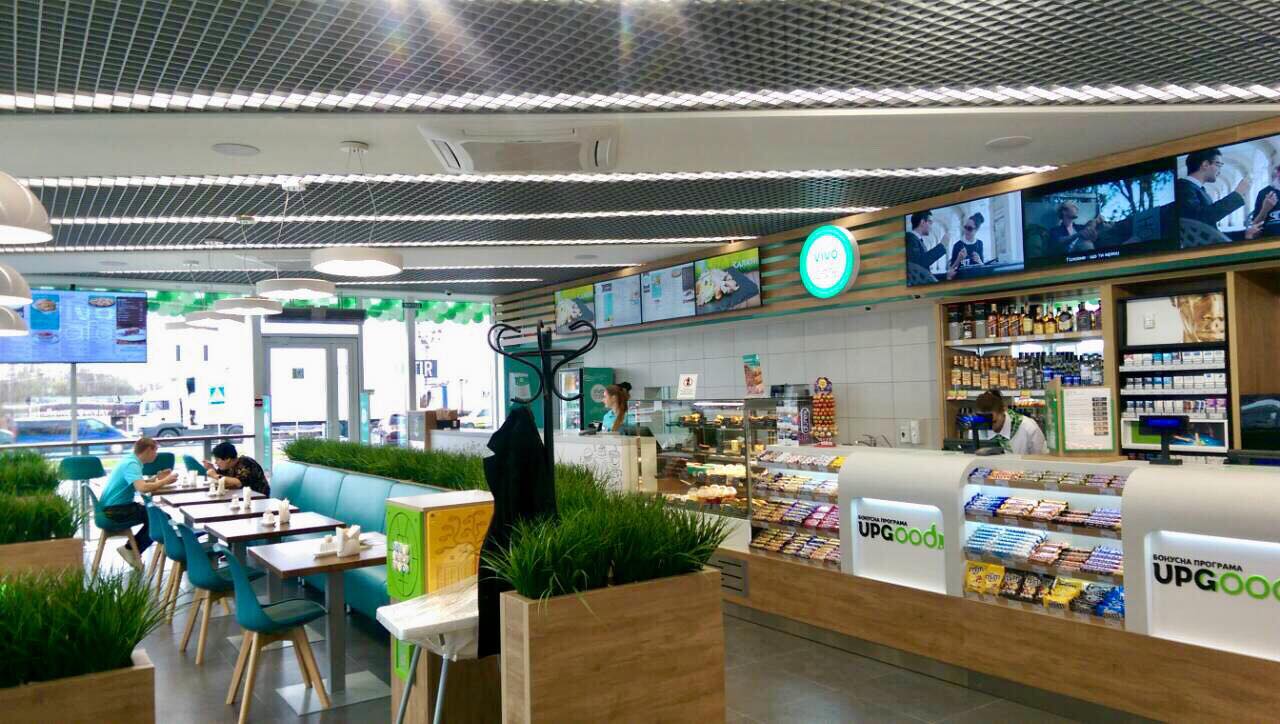 Вместе с автозаправочной станцией работает VIVO-cafe. Посетителям кафе предложена широкая линейка фирменной продукции: бургеры, сэндвичи, буррито, снеки, холодные и горячие напитки.