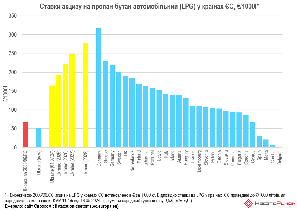 «Вочевидь, сталась помилка, яку потрібно виправити перед голосуванням в парламенті. Урядовці взяли середній показник на бензини та дизпальне, а от ставка акцизу на LPG пропонується встановити найвищу в Європі (більше існує тільки в Данії - €300,0 за 1000 л), а базове співвідношення акцизів газу та бензину в Україні у 2028 може очолити антирейтинг в Європі – 77% при поточному середньому показнику серед усіх країн ЄС – 23%», - говорить аналітик НафтоРинку Олександр Сіренко.