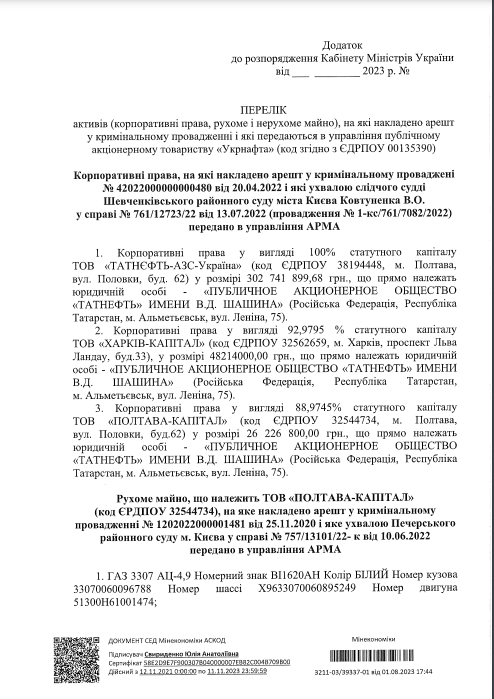 Він також оприлюднив документ без дати. Це додаток до розпорядження Кабміну, який містить повний перелік майна, яке передають в управління «Укрнафті».