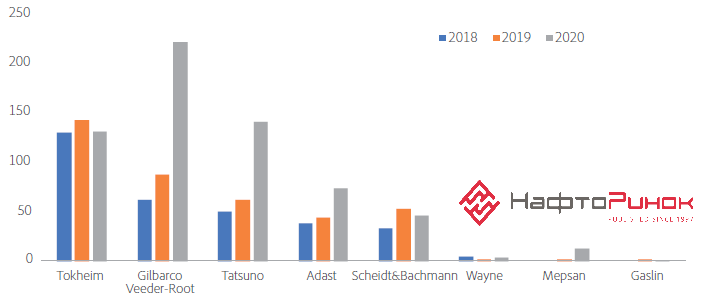 Произошли изменения и в структуре популярности иностранных ТРК, так на первое место вырвалась компания Gilbarco Veeder-Root – 29%, на втором месте оказалась продукция японского бренда Tatsuno – 18%, и на третьем месте бессменный лидер прошлых лет бренд Tokheim – 17% (на 10 единиц меньше Tatsuno).
