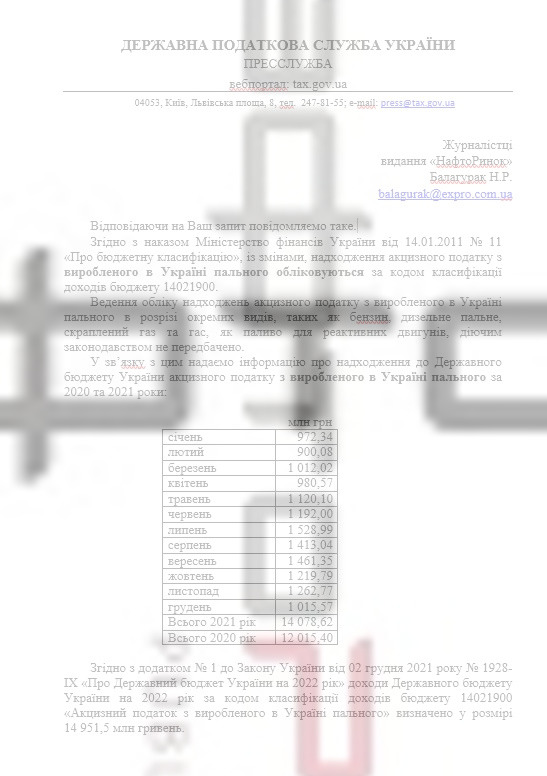 «Ведение учета поступлений акцизного налога с произведенного в Украине топлива в разрезе отдельных видов, таких как бензин, дизельное топливо, сжиженный газ и керосин, как топливо для реактивных двигателей, действующим законодательством не предусмотрено» – отмечается в письме.