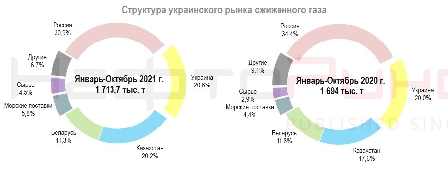 Напомним, в 2020 году Proton Energy в месяц поставлял в Украину от 31 тыс. т до 40 тыс. т LPG. Уже в 2021 году снижение поставок ресурса «Роснефти» послужило окном для поставки спотовых партий сжиженного газа из России и Казахстана в Украину. В январе-октябре 2021 г. они выросли с 43,5 тыс. т, до 192 тыс. т.