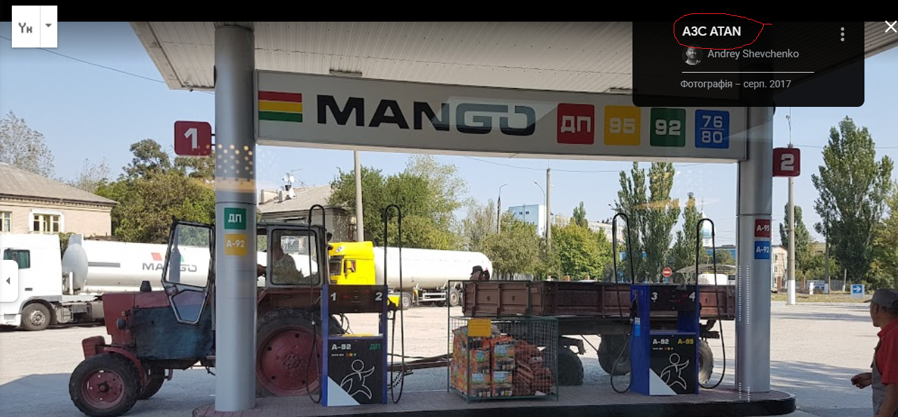 На відео, опублікованому у Twitter, чітко видно стелу АЗС ATAN. Стверджується, що воно знято у Бердянську. На картах Google позначена одна АЗС ATAN – за адресою Мелітопольське шосе, 79. Водночас фото показують, що це АЗС MANGO. Усі вони були опубліковані на Google до повномасштабної війни.