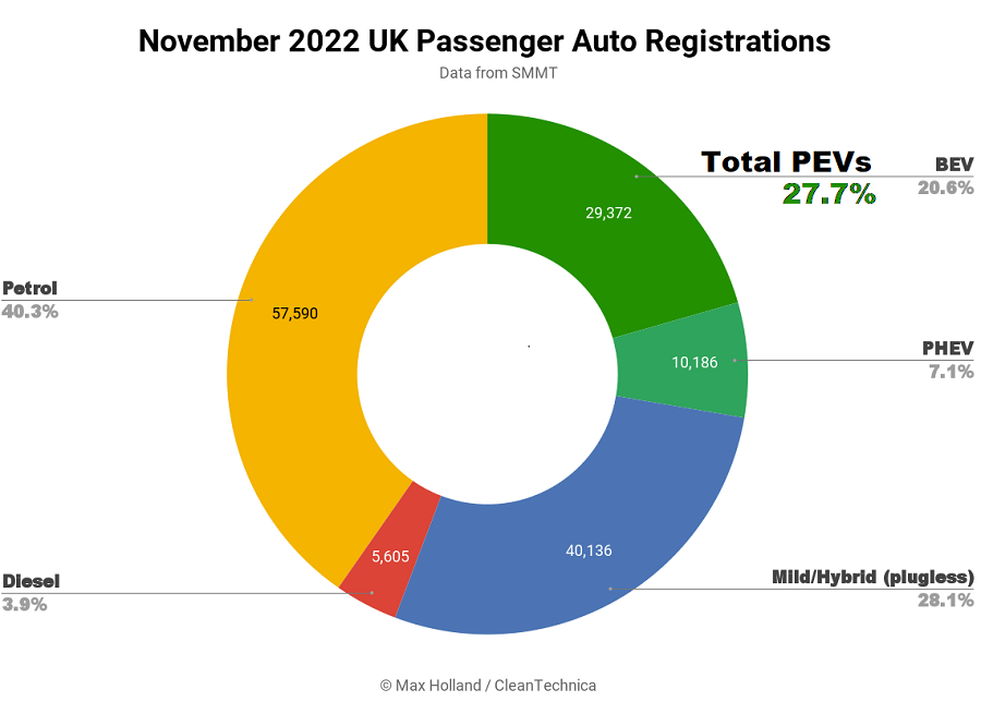У листопаді на електромобілі припадало 27,7% реєстрацій легкових авто у Великій Британії, повідомляє Clean Technica. За місяць було продано 39,56 електрокарів, які заряджаються від мережі.