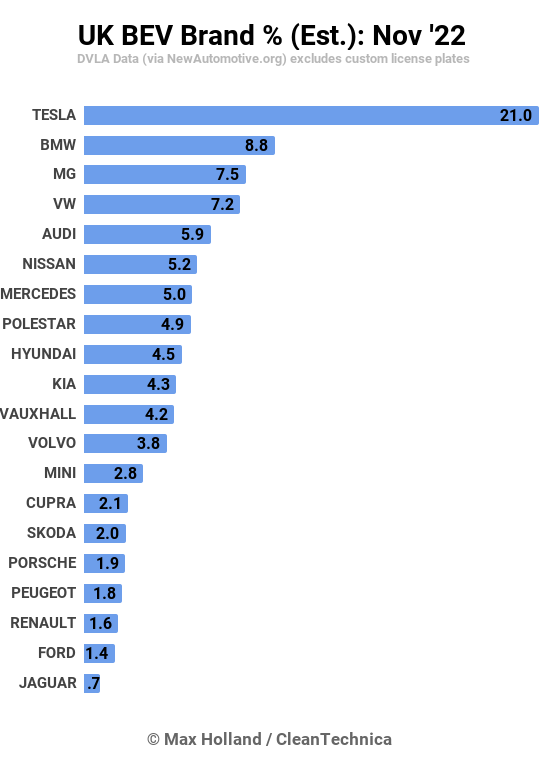 Загалом Tesla різко збільшила поставки своїх авто у листопаді. На автівки цього бренду припадало 21% реєстрацій BEV у Великобританії, тоді як на BMW - 8,8%, а MG - 7,5%.
