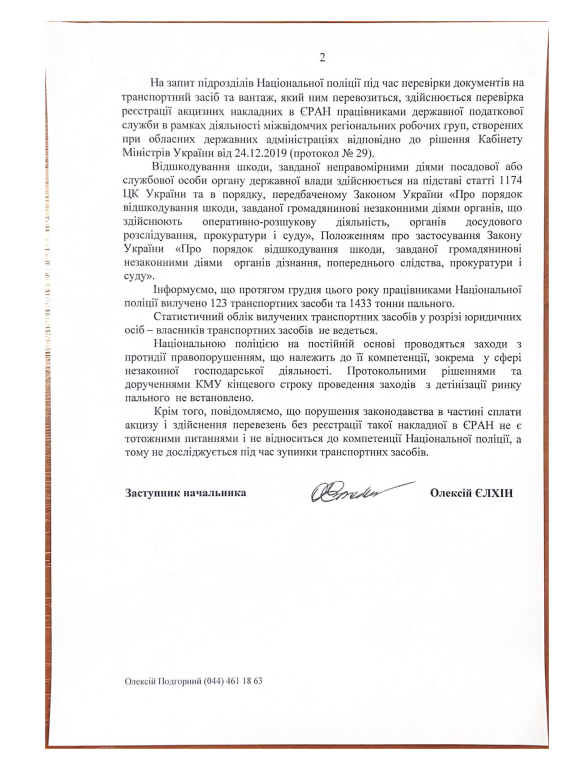 В частности, в декабре 2021 г. работники Нацполиции изъяли 123 транспортных средства и 1433 тонны топлива. Также в МВД отметили, что статистический учет изъятых ТС в разрезе юридических лиц – владельцев ТС не ведется.