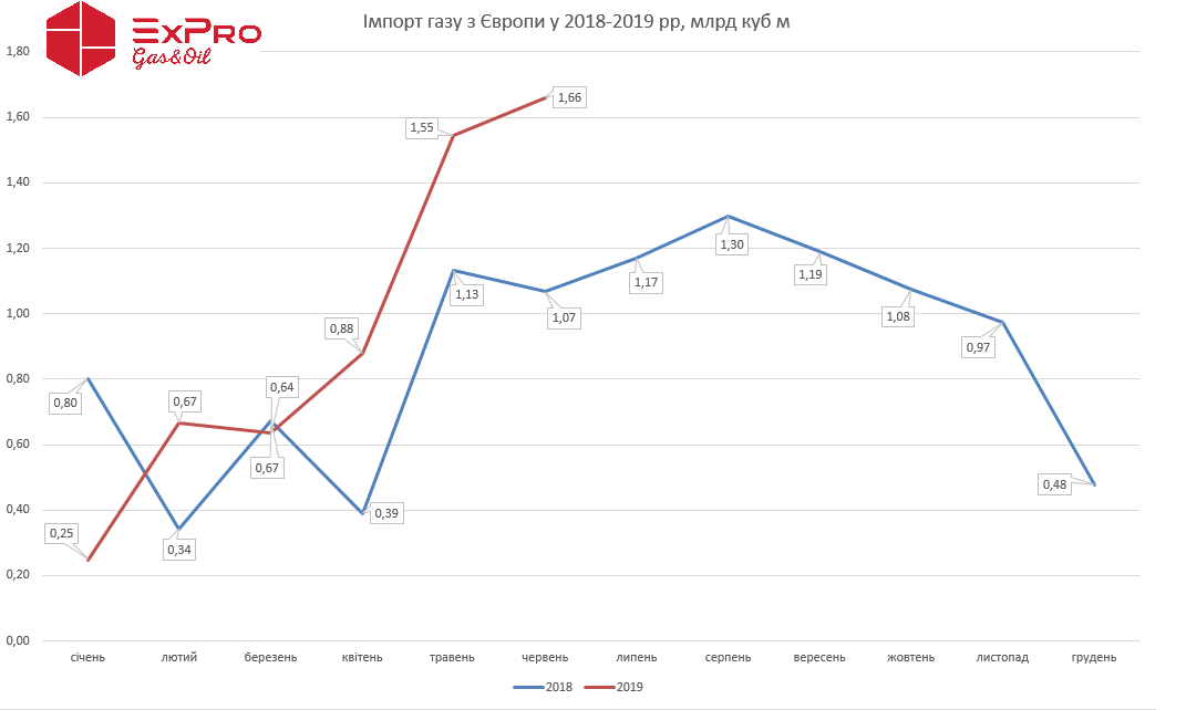 Справка ExPro, в мае 2019р в Украину было импортировано 1,54 млрд куб м газа, что на 36,5% или на 413,65 млн куб м больше, чем за аналогичный период 2018р.За январь-июнь 2019р в Украину из Европы было импортировано 5,63 млрд куб мгаза, что на 22% или 1,23 млрд куб м больше, чем за аналогичный период 2018р.
