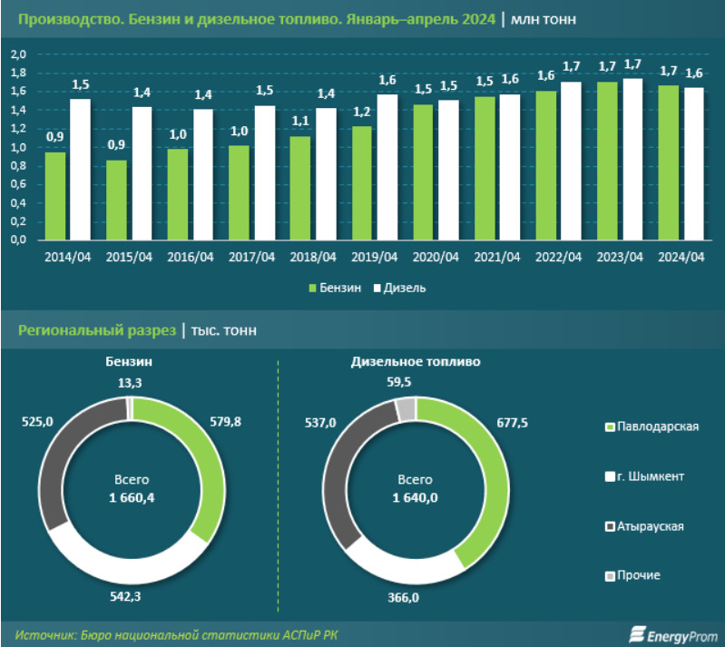 Виробництво бензину в Казахстані в січні-квітні поточного року становило 1,7 млн тон, що на 2,6% менше, ніж за аналогічний період минулого року. Виробництво дизельного пального тим часом скоротилося на 5,5%, до 1,6 млн тон.