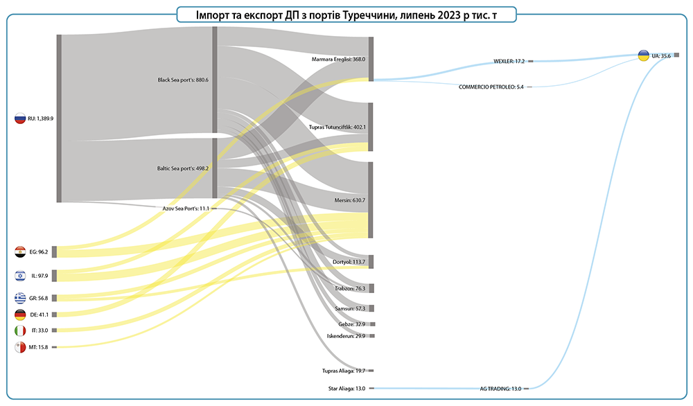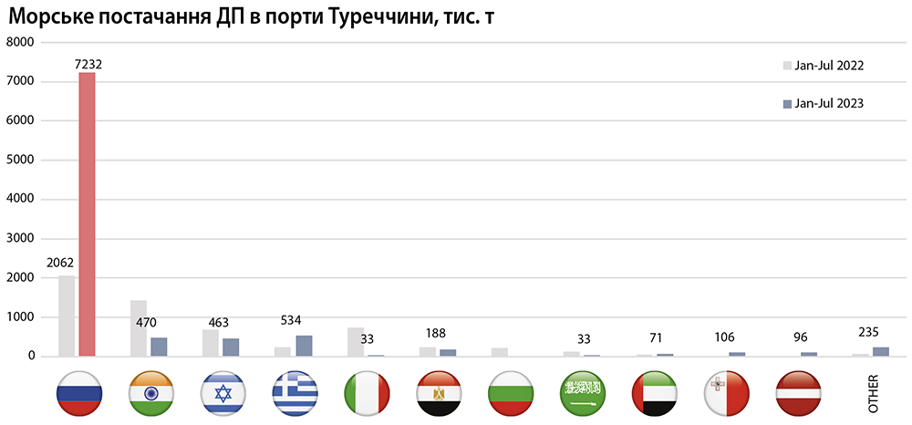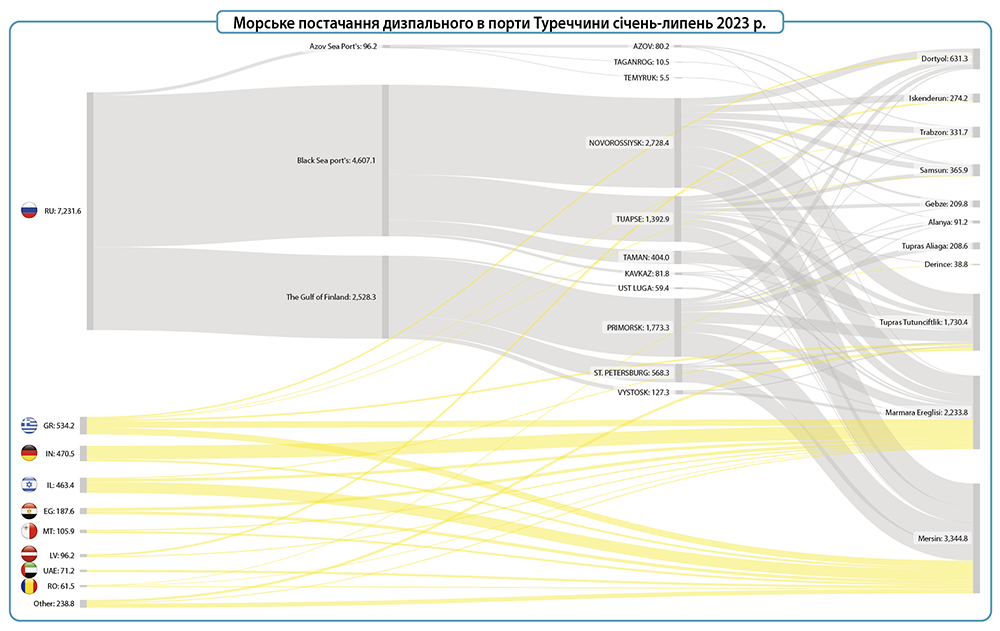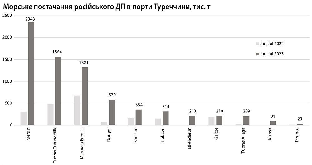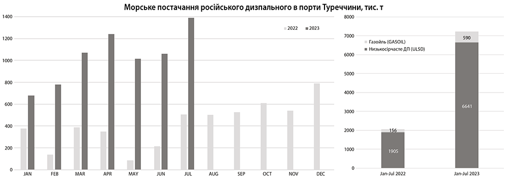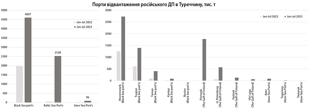 За сім місяців 2023 року з російських морських портів до Туреччини відвантажено 6,64 млн т низькосірчастого дизпального (ULSD), та 590 тис. т газойлю. Більше 63% російського дизелю було завантажено у танкери у чорноморських портах – 4,6 млн т. З них 2,72 млн т припадає на постачання з терміналів у Новоросійську, що більше ніж вдвічі перевищує обсяги за січень-липень 2022 р.