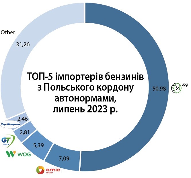 100% обсягу бензину UPG привезла автомобільним транспортом. Як раніше повідомляв НафтоРинок, в липні 2023 р. в середньому на добу кордон перетинали 15 автоцистерн UPG із бензином (40% ринку автомобільних поставок) та 21 бензовоз з дизпальним (близько 11%). За даними статистики в липні кожна шоста автоцистерна з імпортним пальним прямувала на адресу UPG. З території Польщі UPG здійснила половину бензовозного постачання.