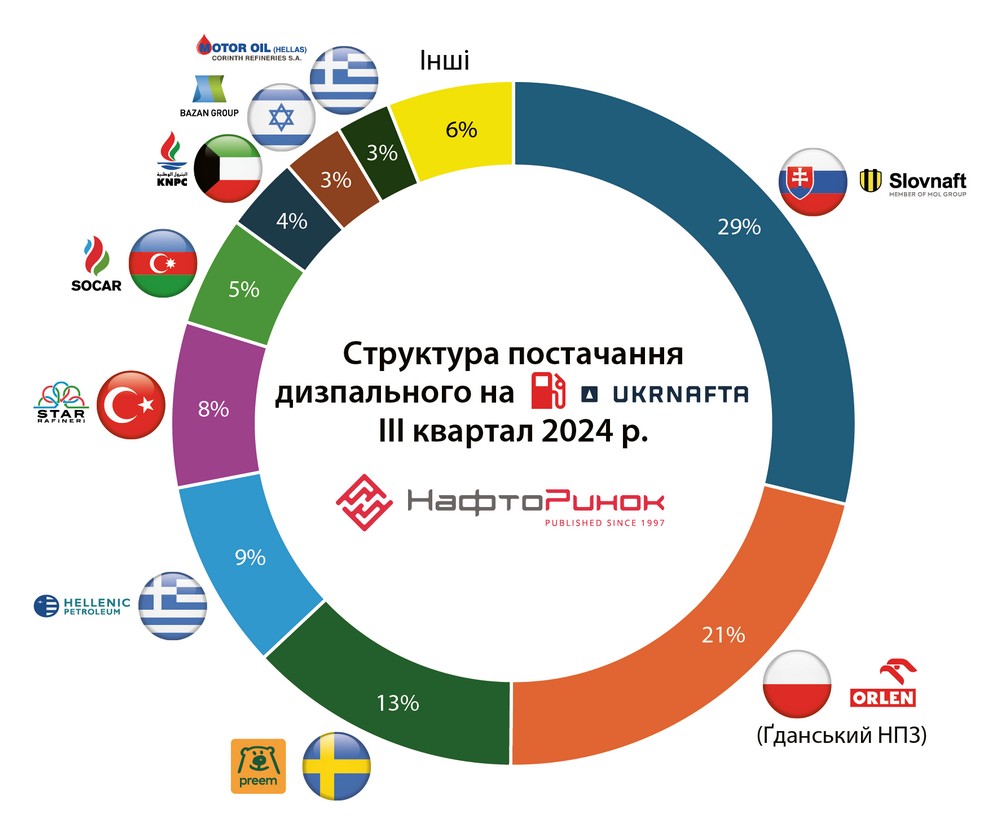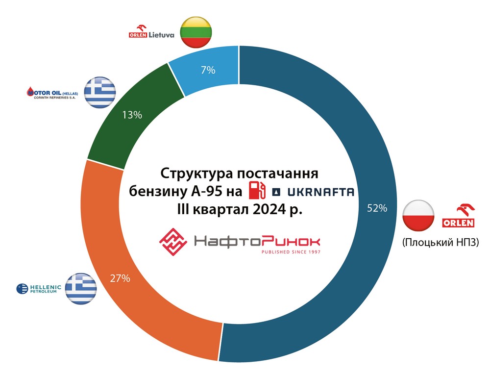 За даними НафтоРинку, у третьому кварталі 2024 р. «Укрнафта» напряму імпортувала 12,9 тис. т бензину А-95 – увесь обсяг припадав на продукт виробництва PKN Orlen. Імпорт ДП становив 9,7 тис. т – виробництва PKN Orlen та шведської Preem.