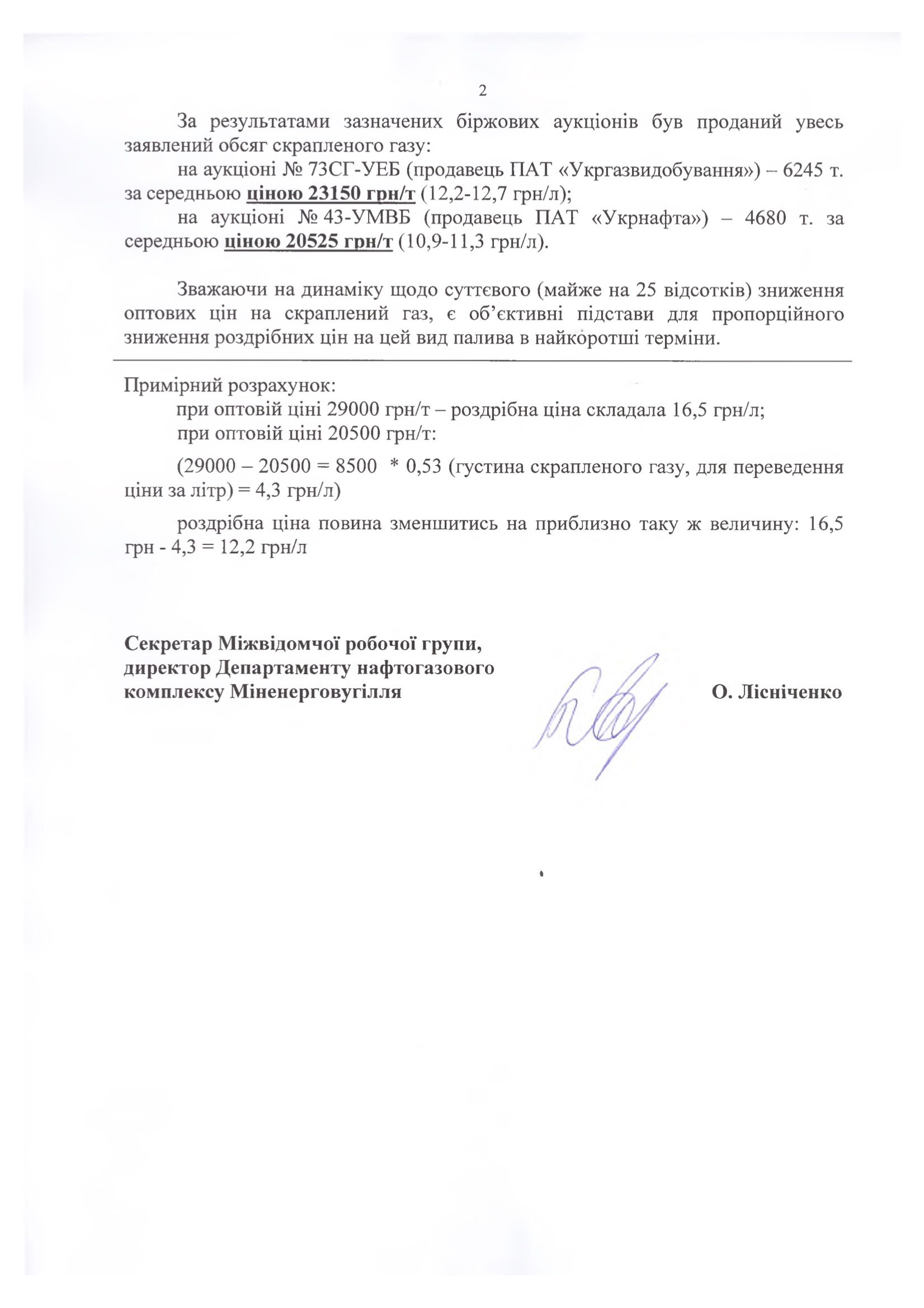 В Министерство энергетики и угольной промышленности Украины отмечают, что на сегодняшний день на рынке сложились все предпосылки для снижения розничной цены до 12,20 грн/л (22 800 грн/т). «Ввиду существенного снижения оптовых цен на сжиженный газ (почти на 25%), сложились все объективные предпосылки для пропорционального снижения розничных цен на этот вид топлива… Розничная цена должна снизиться примерно на такую же величину (как и оптовая - ред): 16,5-4,3 =12,2 грн/л», - говорится в письме.