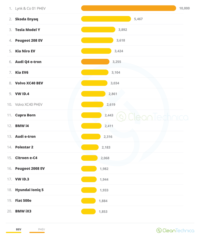 Найпопулярнішим електрокаром 2022 року став китайський гібрид Lynk & Co 01 PHEV з 10 тис. реєстрацій. Ця модель сильно відірвалася від конкурентів. Переможень попереднього року - Skoda Enyaq - в 2022-му посів друге місце (5,5 тис. реєстрацій), а Tesla Model Y завдяки рекордним продажам в грудні (2,3 тис. од.) вийшла на третє місце з 3,9 тис. реєстрацій за підсумками року.