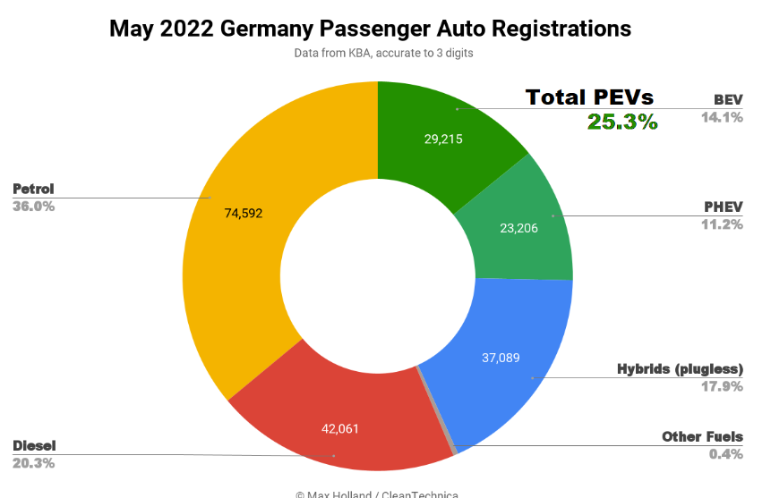 В Німеччині, на найбільшому європейському автомобільному ринку, частка електромобілів у травні сягнула 25,3% продажів легкових авто, тоді як за аналогічний місяць 2021 року цей показник становив 23,4%, повідомляє Clean Technica. Продажі чистих акумуляторних електрокарів (BEV) збільшилися до 14,1% (з 11,6% в травні 2021 р.), а гібридів (PHEV) - зменшилася до 11,2% (з 11,8% в травні 2021 р.).