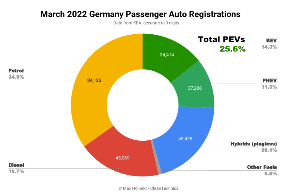 Зростання у порівнянні з аналогічним місяцем минулого року є відносно невеликим. У березні 2021 року частка електромобілів становила 22,5%. Проте потрібно взяти до уваги, що загальні продажі авто знову стрімко падають. Криза на авторинку поглибилася після початку російсько-української війни. В Березні в Німеччині було зареєстровано 241,33 тис. нових авто, що на 17,5% менше в порівнянні з минулим роком і приблизно на 31% менше, ніж середній місячний показник за 2017-2019 роки.