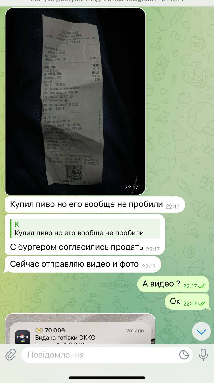 Згідно з опублікованими товарними чеками, йдеться про дві АЗС у Києві. Як стверджує Telegram-канал, чоловік купив на одній з АЗС OKKO пиво і бургер о 22:23, проте алкогольний напій провели як видачу готівки. На іншій заправці йому продали пиво о 22:43, і воно було в чеку.
