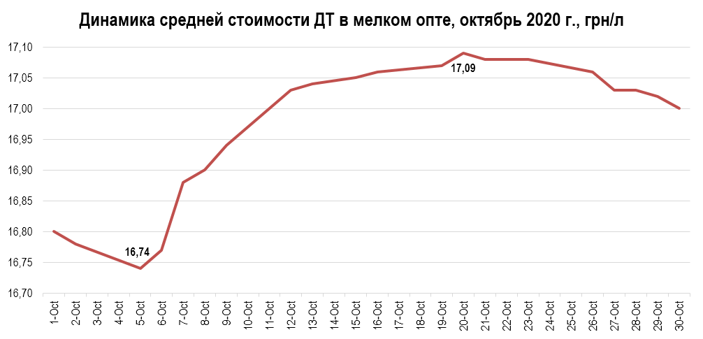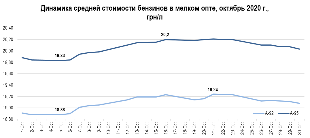 В сравнении с октябрем 2019 г. цена дизтоплива автонормами упала в среднем на 30% (-5,42 грн/л), бензин А-92 потерял 10% (-2 грн/л), А-95 подешевел на 9% (-1,8 грн/л), чему способствовал обвал котировок на внешних рынках в первой половине 2020 г. из-за пандемии (в Украине минимум был зафиксирован в мае – ДТ -38% (-5,97 грн/л до уровня 15,5 грн/л), А-92 подешевел на 27% (-4,59 грн/л до 16,5 грн/л), А-95 потерял 26% (-4,63 грн/л до 17,3 грн./л).