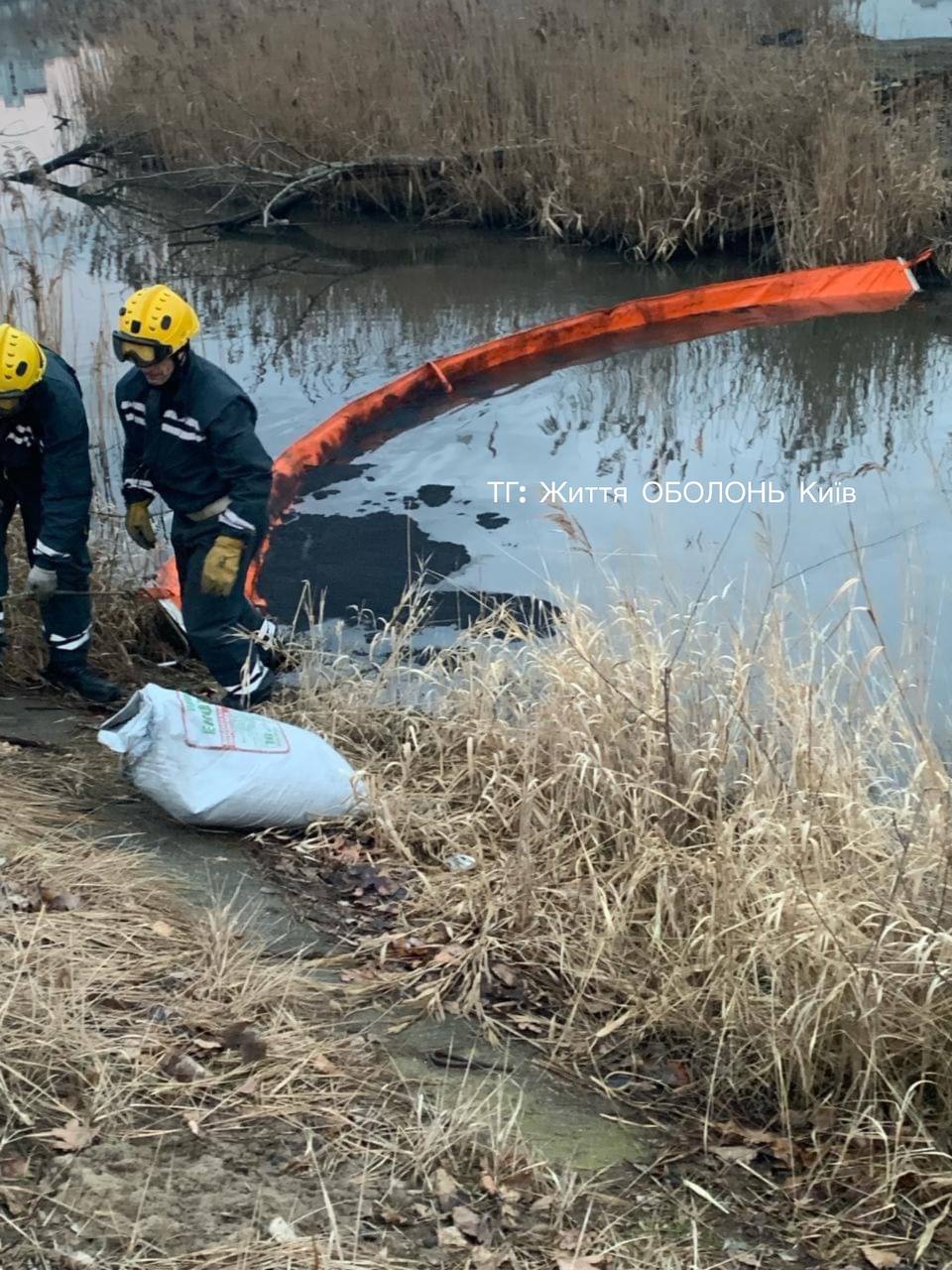 За інформацією Telegram-каналу «Життя Оболонь Київ», нафтопродукти, ймовірно, скинули в річку Сирець, через яку вони потрапили в озеро Кирилівське.