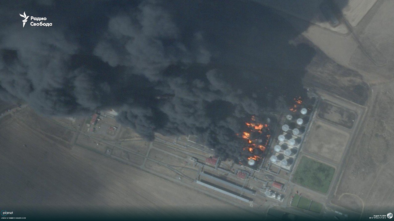 За інформацією російського відділення Радіо Свобода, станом на 14:23 19 серпня (за місцевим часом) було вогнем охоплено вже понад 10 цистерн із паливом. Про це свідчить супутниковий знімок нафтобази.