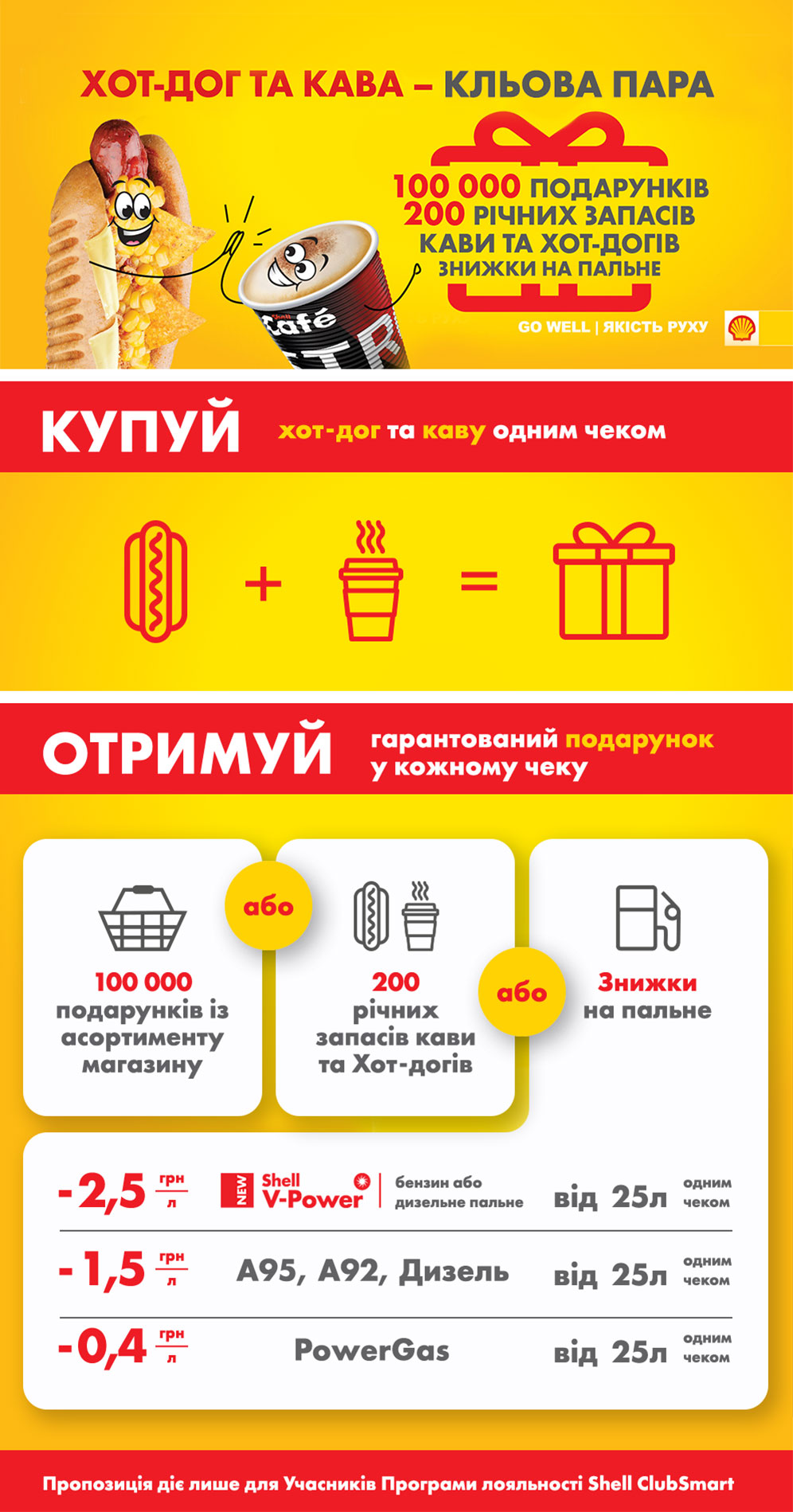 Акция действует при наличии товара. Акции не суммируются. Получить подарок клиент имеет право на любой действующей АЗС Shell только при предоставлении зарегистрированной карты лояльности Shell ClubSmart или Shell OTP, которая была использована при покупке кофе и хот-дога.