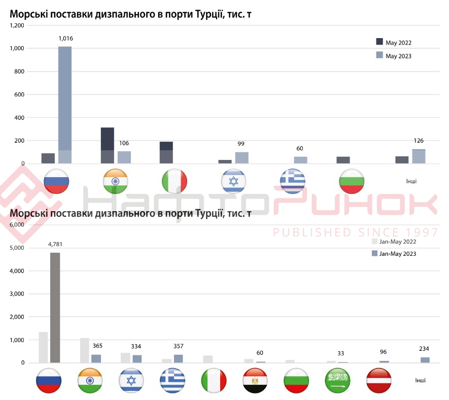 Всього за 5 місяців 2023 року надходження дизпального з російських портів до Туреччини зросло більше ніж втричі – з 1,34 млн т, до 4,78 млн т.