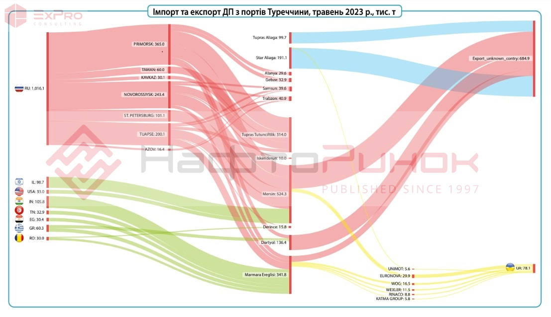 З огляду на посилення контролю за недопущенням постачання російських нафтопродуктів в Україну, українським трейдерам варто ретельно досліджувати ресурс що пропонується в портах Туреччини. Не менше 35% ДП, що перевалювалось терміналом в травні OPET в травні, надійшло з росії: до 91 тис. т дизпального з російських портів Туапсе (постачальник GMS TRADING), Приморськ (NEST WISE PETROLEUM), Новоросійськ (LITASCO). Також трейдингова компанія «Лукойлу» LITASCO поставила на OPET 33 тис. т ДП з туніського порту La Skhirra. Проте, основні обсяги надходжень на термінал OPET в травні сформували судна завантажені 105,8 тис. т індійського ДП від Reliance Industries, і 32 тис. т з НПЗ грецької Hellenic Petroleum.