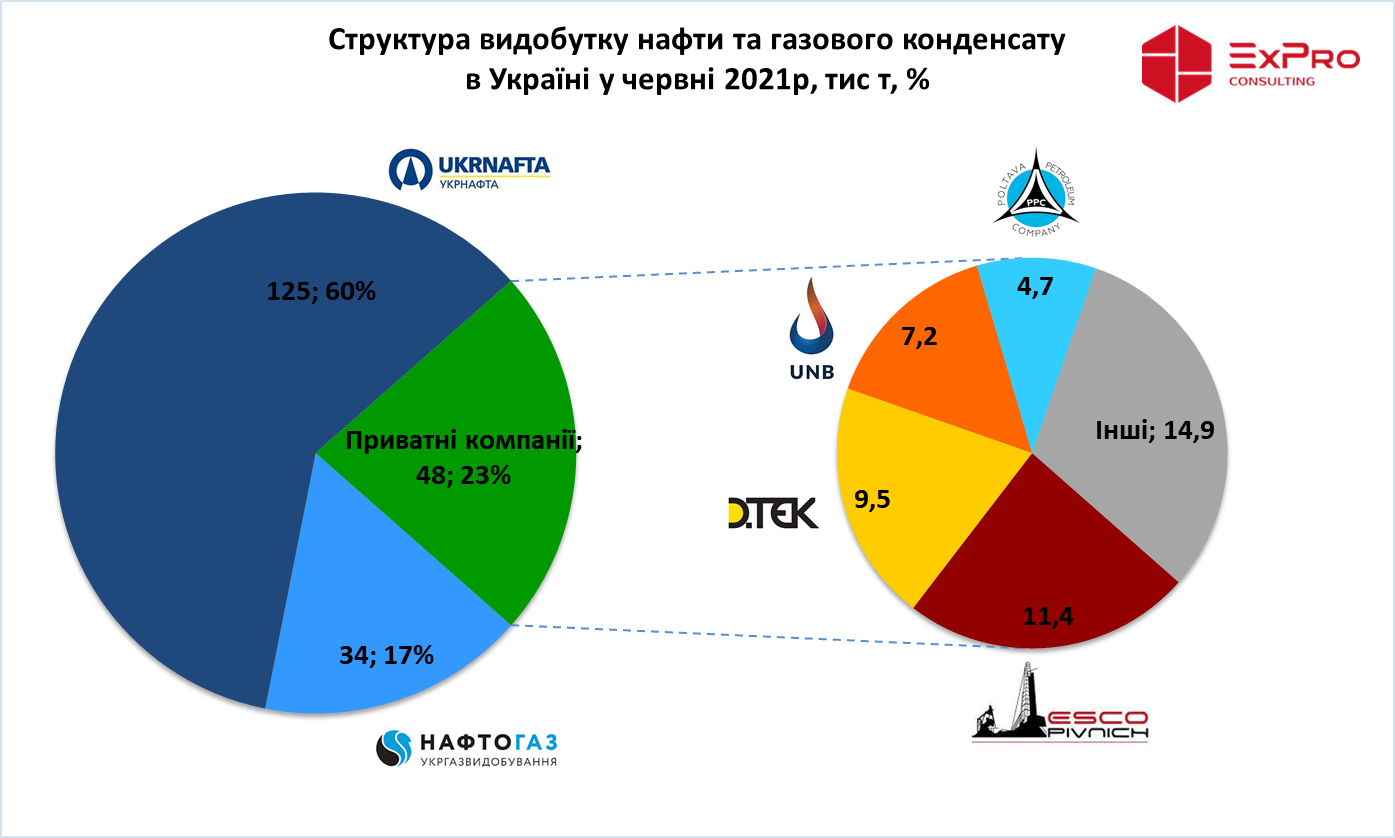 По данным консалтинговой компании ExPro в июне 2021г добыча нефти и газового конденсата частными компаниями выросла на 10,8 тыс т (+ 30%) по сравнению с июнем 2020 до 48 тыс т. Это рекордный показатель за всю историю независимой Украины.