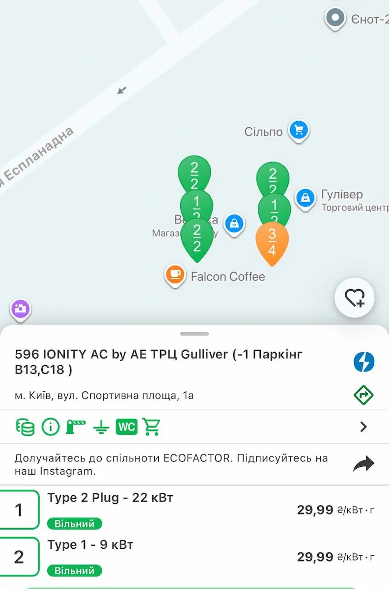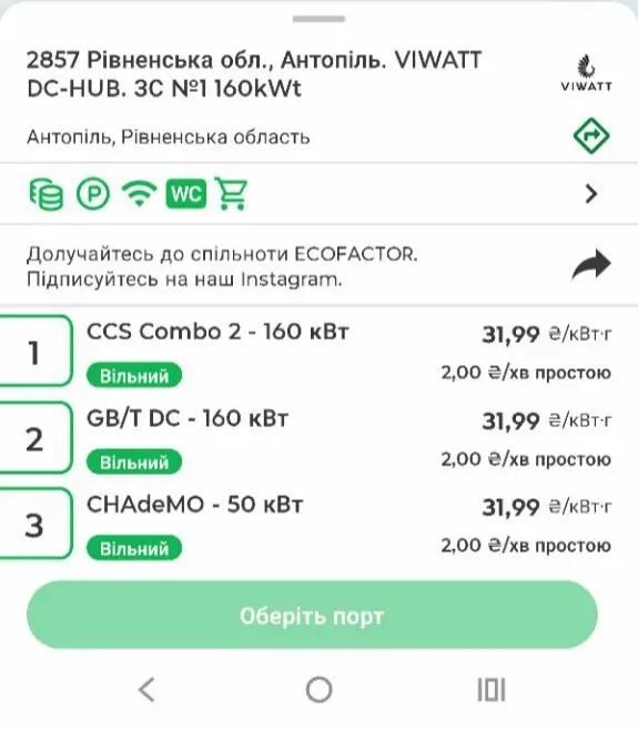 На деяких станціях інших операторів є і вищі ціни. Наприклад, в Антополі Рівненської області зарядка на станції VIWATT потужністю 160 квт коштує 31,99 грн/кВт-г, свідчать дані в застосунку Ecofactor.