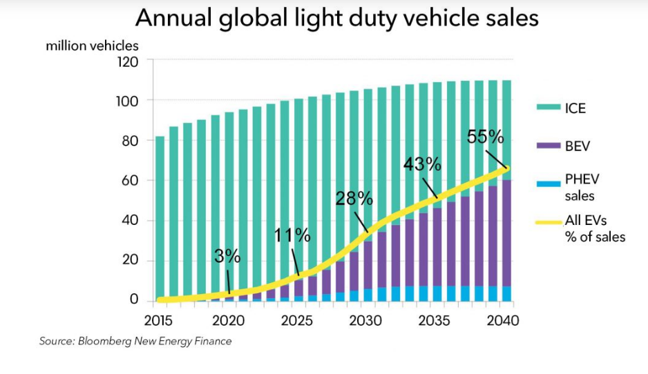 Очікується, що в 2040 році 80% світового муніципального парку будуть електричними. У другій половині 2020-х років електрифікація автомобільного транспорту досягне високої швидкості завдяки зниженню вартості батареї та масштабному виробництву: продажі електромобілів становлять 28%, а електробусів – 84%. відповідних світових ринках до 2030 року.
