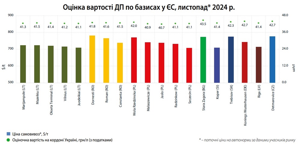Середня ціна ДП при постачанні автотранспортом 11 листопада становила 43,52 грн/л, що на 0,20 грн/л (–0,5%) менше, ніж у п’ятницю. Зменшення ціни триває третій день поспіль. Водночас з кінця жовтня вартість дизелю зросла в середньому на 0,85 грн/л (+2%).