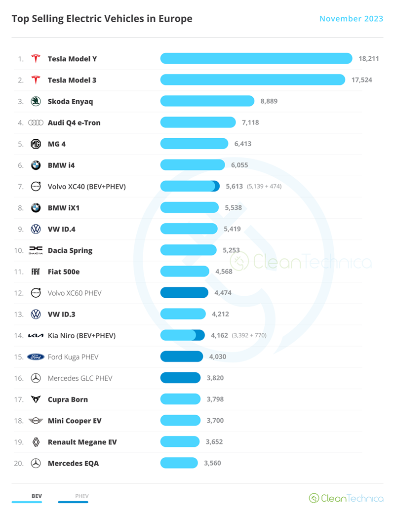 Продажі електрокарів у Європі в листопаді скоротилися вперше з липня 2022 року, повідомляє Clean Technica.