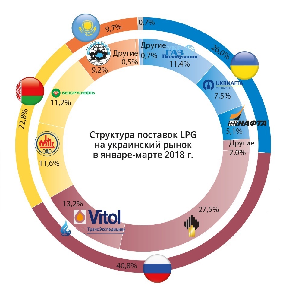 Главным поставщиком LPG в Украину является Российская Федерация. С учетом реэкспортных объемов через Беларусь доля РФ в балансе импорта составляет почти 45% — 158,7 тыс. т. По сравнению с январем-мартом 2017 года, в связи с ограничением экспорта в Украину, поставки газа российского производства снизились на 21,7%.