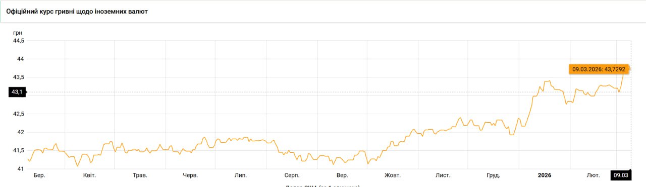 НБУ в понеділок, 9 березня, вийшов з курсом долара у 43,7293 грн, що на 62 коп. більше, ніж тиждень тому, 2 березня.