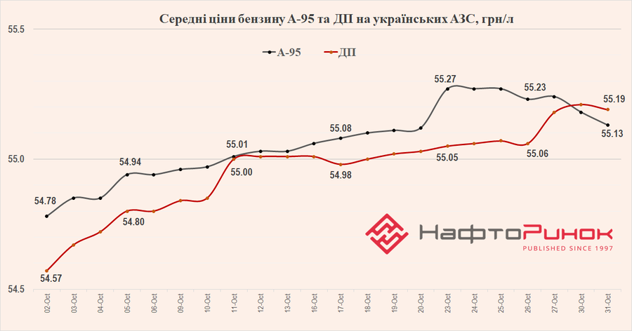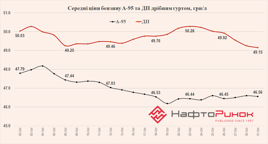 Тенденція зменшення вартості пального відобразилася на ціноутворенні на українських АЗС: у останні дні жовтня вартість пального також почала рухатися вниз. Щоправда, у порівняні з початком місяця ціни все одно зросли: середня вартість дизпального збільшилася на 0,79 грн (+1,5%). Середня вартість бензину А-95 збільшилась на 0,16 грн (+0,3%).