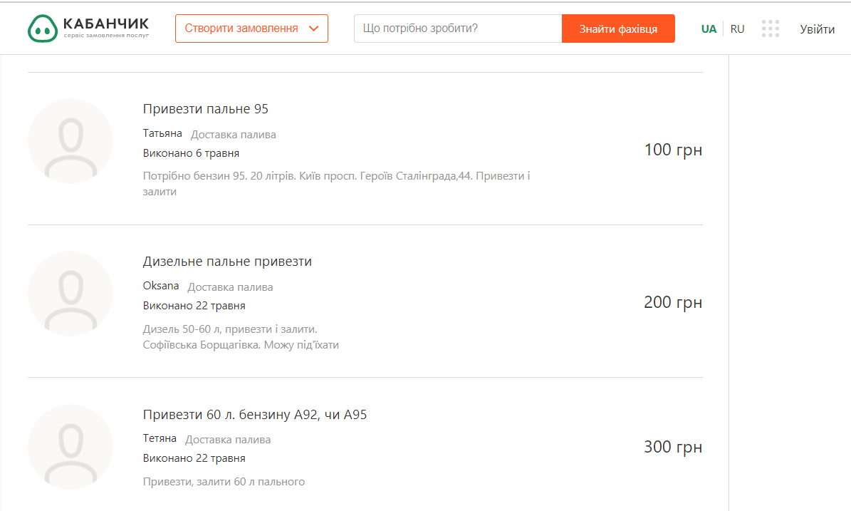 Популярний сайт послуг Kabanchik.ua теж пропонує послугу в категорії «Доставка кур’єром» доставку палива, тобто за вас можуть постояти в черзі за пальним. Наші фахівці дослідили для вас скільки коштує постояти в черзі та купити пальне.