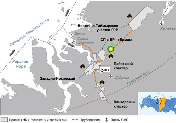 Проект «Схід Ойл» охоплює найбільші родовища на півночі Красноярського краю, в тому числі надгігантські нафтогазові поклади Ванкорського кластера (Ванкорське, Сузунське, Човнове, Тагульське, Ічеммінське) та Паяхське родовище нафти, а також Західно-Іркінську ділянку.