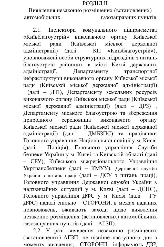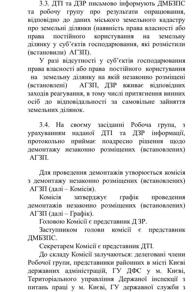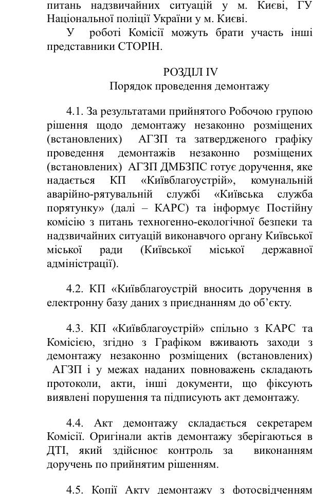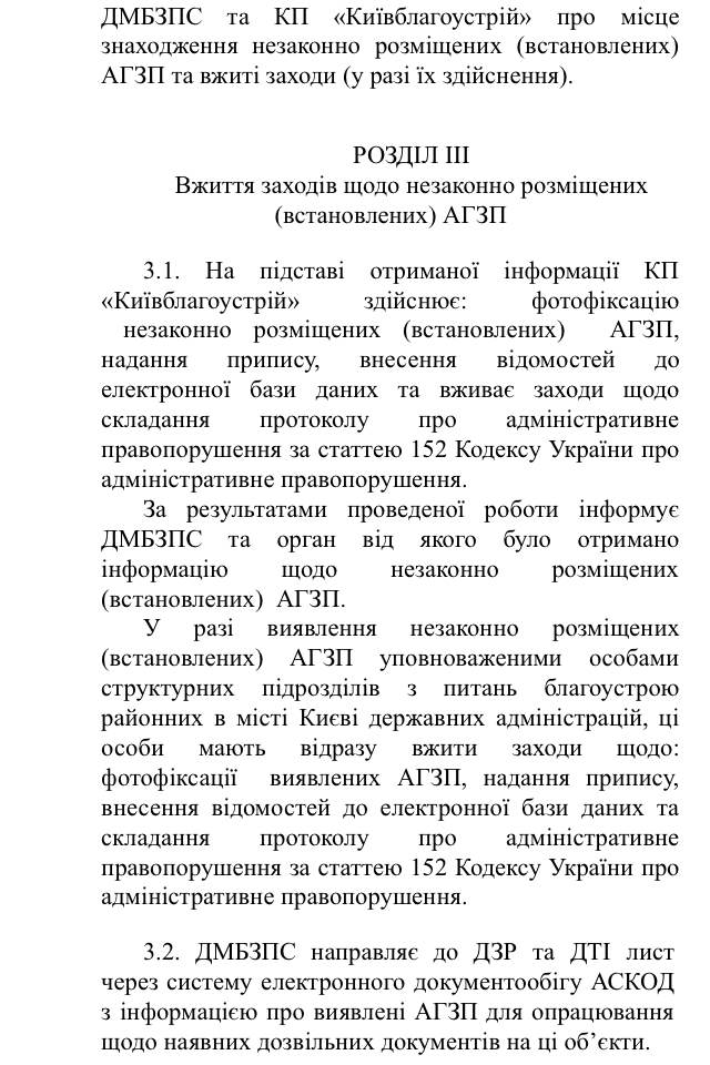 В частности, в проекте указан перечень органов и подразделений городской исполнительной власти (КП «Киевблагоустрий», департамента земельных ресурсов, департамент транспортной инфраструктуры, и др.), Нацполиция и СБУ Киева, ГСУ по вопросам труда, ГСЧС, ГФС Киева и др., которые в рамках предоставленных полномочий принимают меры по выявлению незаконных АГЗП. При этом в документе не указаны сами параметры «незаконности» или нормы, регламентирующие размещения АГЗП. Вместе с этим, в случае выявления такого объекта описана процедура и ответственные за его демонтаж.