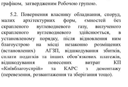 Вернуть изъятое оборудование и газ владелец сможет только после восстановления им благоустройства на месте демонтажа, а также после восполнения ущерба, оплаты налогов и других обязательных платежей, восполнения понесенных затрат КП «Киевблагоустрий» и КАРС по демонтажу (перевозка, выгрузка, хранение и т.д.).