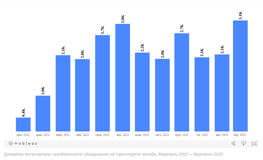 На діаграмі нижче - динаміка встановлення ГБО в квітні 2022-березні 2023 рр.