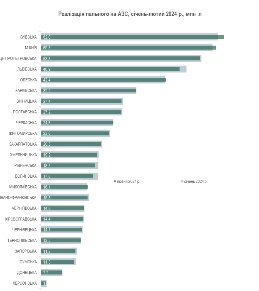 Рейтинг областей за продажами пального у 2024 р. у порівнянні з 2023 р. майже не зазнав змін: до лідерів продовжують входити Київщина та м. Київ з показниками реалізації у лютому 62,0 млн л (10,4% від загального обсягу) та 59,3 млн л (10,0%) відповідно. Слідом йдуть Дніпропетровщина з показниками 53,8 млн л або 9,0%, яка цьогоріч посунула Львівщину з третього місця на четверте, а також Одещина та Харківщина.